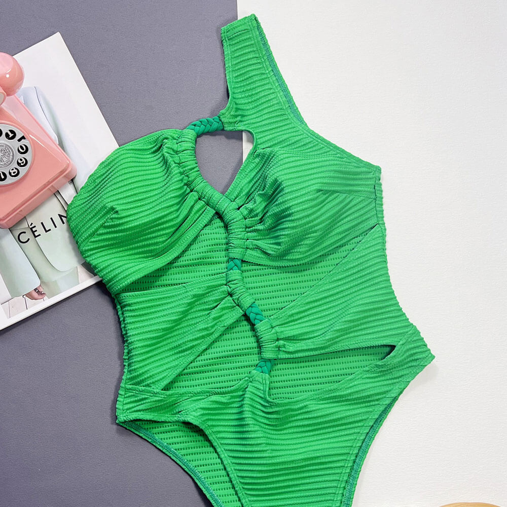 Maak een gedurfde indruk met dit stijlvolle en opvallende Brazilian badpak! De ribgebreide stof in een tropische tint zorgt voor een luxe uitstraling, terwijl het asymmetrische one-shoulder design een elegante touch toevoegt. De charmante cut-outs aan de voorkant en een vlechtband detail in het midden creëren een trendy, speelse look. De verwijderbare soft padding cups bieden extra ondersteuning en comfort, terwijl het cheeky bikini broekje je rondingen flatteert.