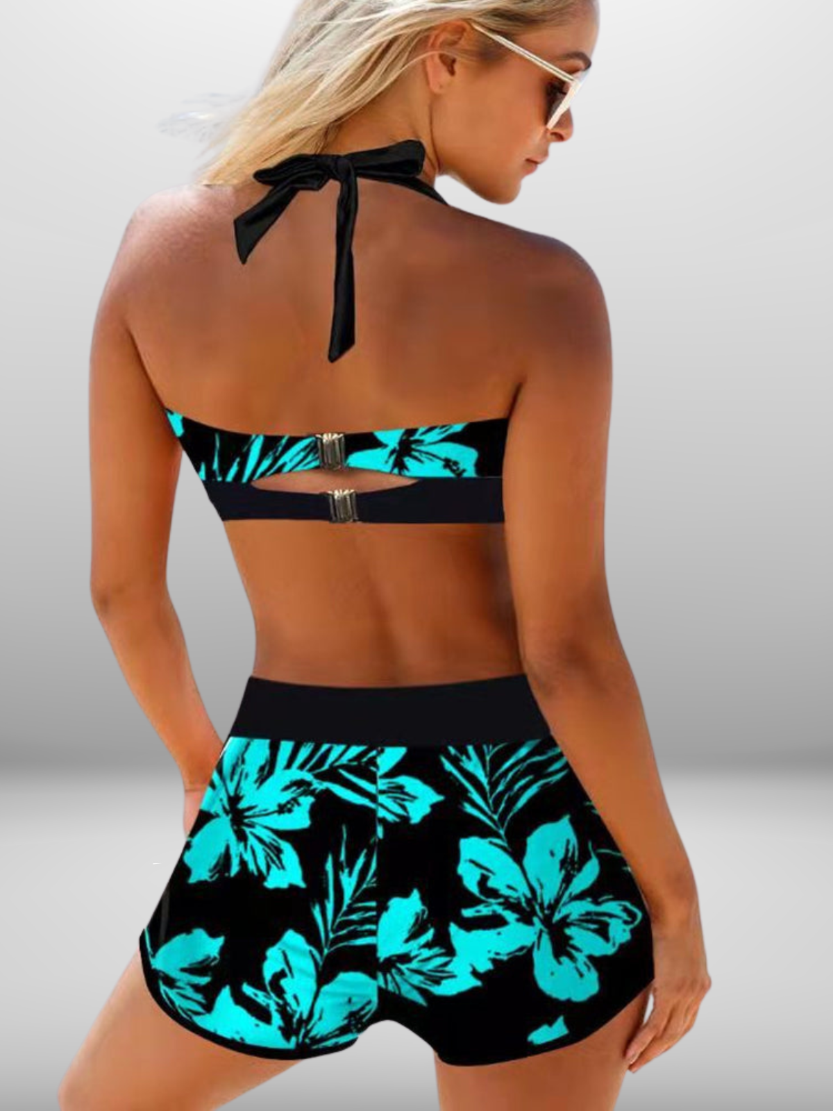Maravina brengt tropische flair en flatterend comfort samen in een stijlvolle bikini set. De vaste schouderbanden bieden betrouwbare ondersteuning, terwijl het charmante strikdetail tussen de cups een speelse twist geeft. Het bijpassende shortje met hoge taille zorgt voor extra bedekking en accentueert het figuur op een natuurlijke manier. Met een krachtig bloemenmotief straalt deze bikini zomerse energie uit bij elke gelegenheid.