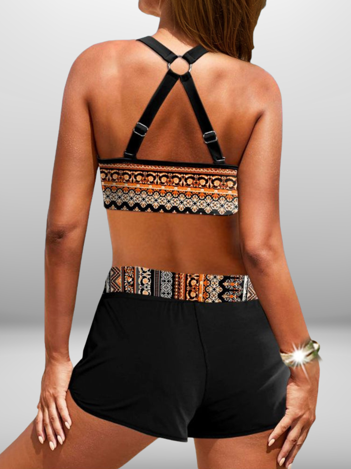 Tarelli combineert comfort en karakter in één opvallende bikini set. Met rijke etnische patronen en warme kleurtinten is deze set perfect voor wie stijl en functionaliteit wil samenbrengen. De top biedt stevige ondersteuning dankzij de brede bandjes en elegante zilverkleurige ringdetails, terwijl het bijpassende shortje met verstelbaar koord zorgt voor een relaxte en veilige pasvorm. Ideaal voor zowel zonnebaden als actieve zomerdagen.