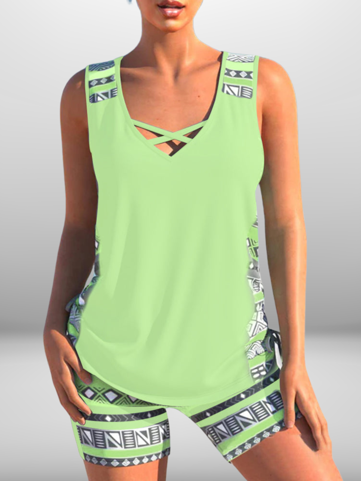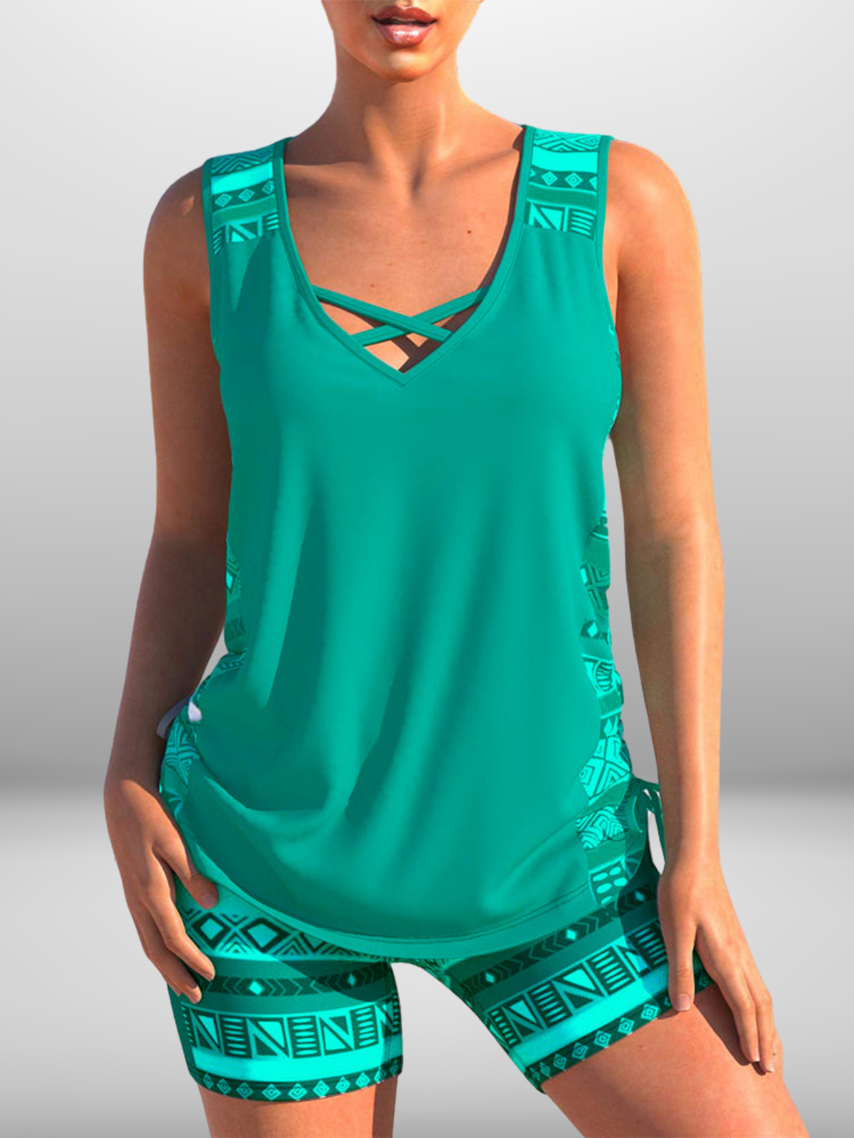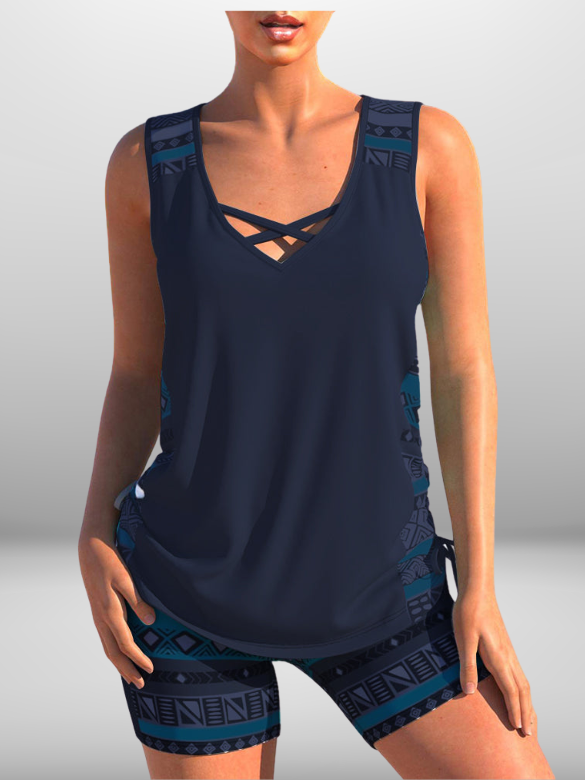 Zantiva is dé tankini voor wie houdt van vrouwelijkheid met een sportieve edge. De losvallende top flatteert moeiteloos en de gekruiste V-hals zorgt voor een stijlvolle touch. De bijpassende aansluitende short benadrukt je figuur op een comfortabele manier, terwijl de moderne geometrische print een krachtige uitstraling geeft.