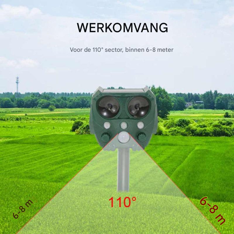 Effectieve dierenafschrikking – Zendt ultrasone geluiden uit die katten, honden, vossen en ratten afstoten zonder schade aan te richten.