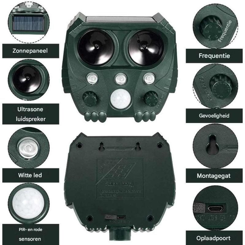 Dit ultrasone afweermiddel biedt een veilige, humane en energiezuinige manier om uw eigendom te beschermen tegen ongewenste dieren. Dankzij de brede dekking, instelbare sensoren en het duurzame ontwerp is dit een betrouwbare oplossing voor het ongediertevrij houden van tuinen, gazons en buitenruimtes.