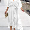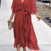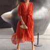 De Thyra jurk heeft een stijlvolle V-hals en een losvallend ontwerp dat mooi rond het lichaam valt. De aangesloten taille geeft een nette vorm, terwijl de rok vloeiend naar beneden loopt. Geschikt voor diners, feestjes, bruiloften of dagelijkse outfits met een elegante uitstraling. Combineer met hakken, sandalen of een denim jasje voor verschillende stijlen.