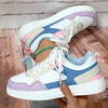 De sneakers hebben een opvallend palet met zachte pasteltinten, waardoor ze direct in het oog springen. Door de vetersluiting sluiten ze stevig rond de voet, terwijl de binnenzool prettig aanvoelt bij dagelijks gebruik. Dankzij de rubberen buitenzool zijn ze geschikt voor binnen- en buitenactiviteiten en eenvoudig te combineren met jeans, leggings of sportieve outfits.