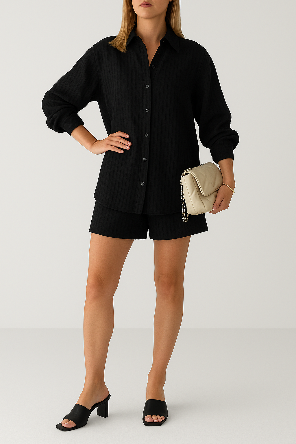 Het luchtige overhemd heeft een lichte structuur die een verfijnde uitstraling geeft, terwijl de comfortabele shorts zorgen voor beweeglijkheid en vrijheid. Combineer de set met sneakers of sandalen voor een casual, stijlvolle look.