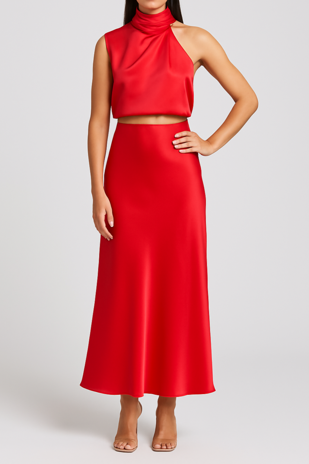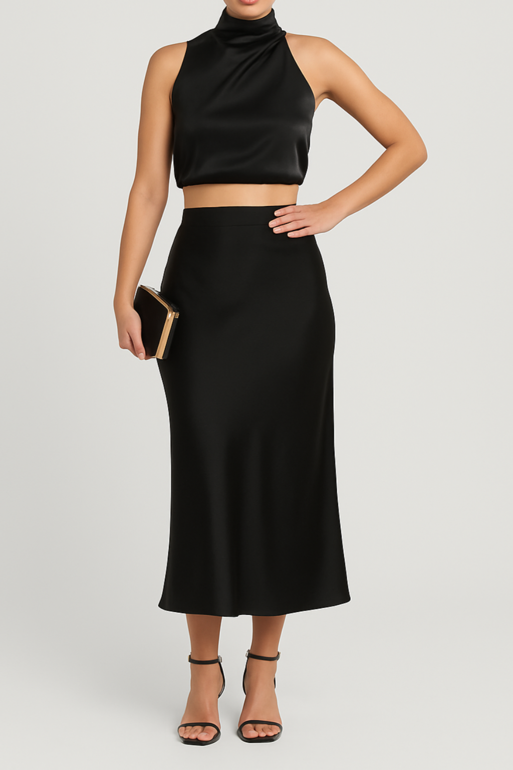 Orielle – Luxe Satijnen Halterset met Maxi Rok en Open Rug