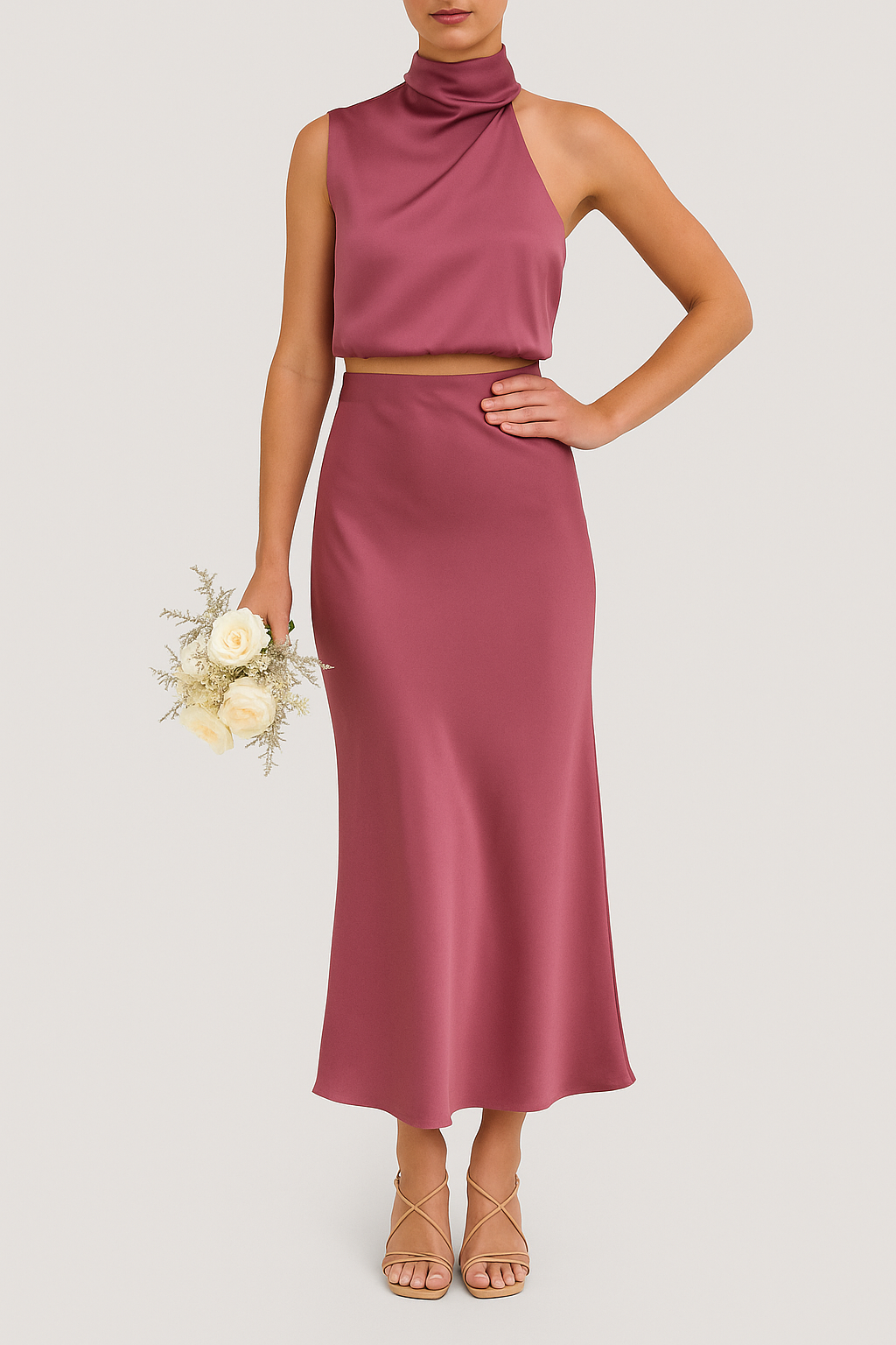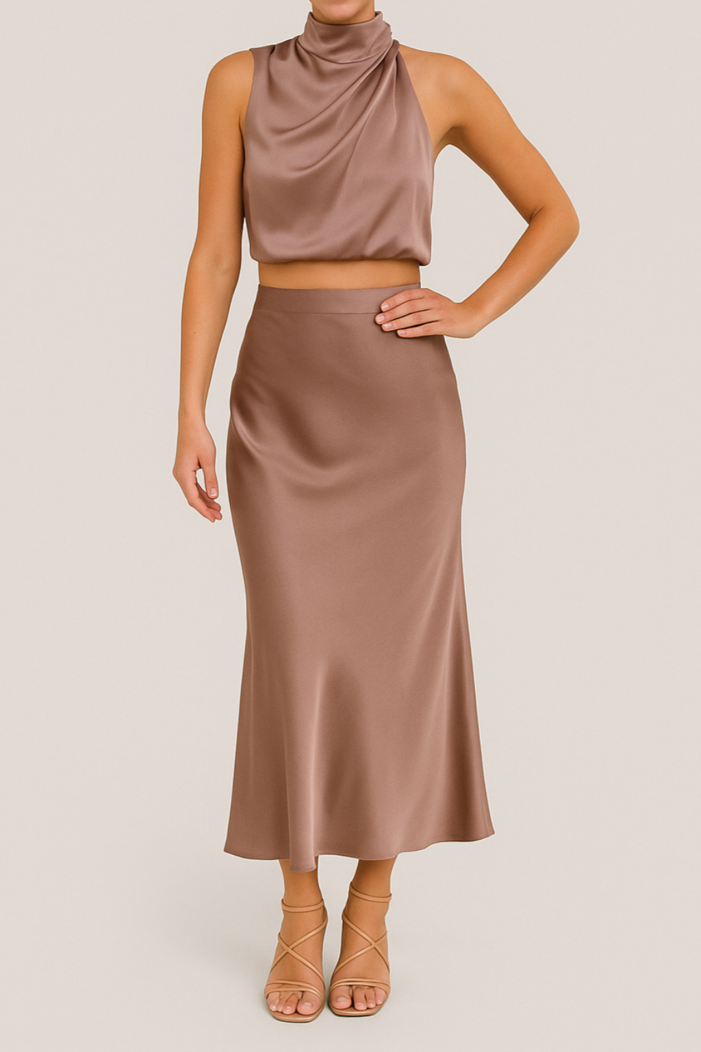 Ervaar pure elegantie met de Orielle Set — een verfijnde tweedelige outfit van glanzende satijnstof die perfect is voor speciale gelegenheden. De combinatie van een aansluitende haltertop met open rug en een vloeiende maxi rok benadrukt de vrouwelijke silhouet en zorgt voor een stijlvolle en moderne uitstraling.